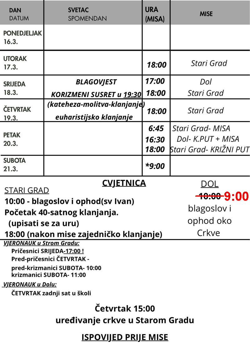 Nedjeljom u 9:00 h u župnoj crkvi sv. Mihovila u Dolu.